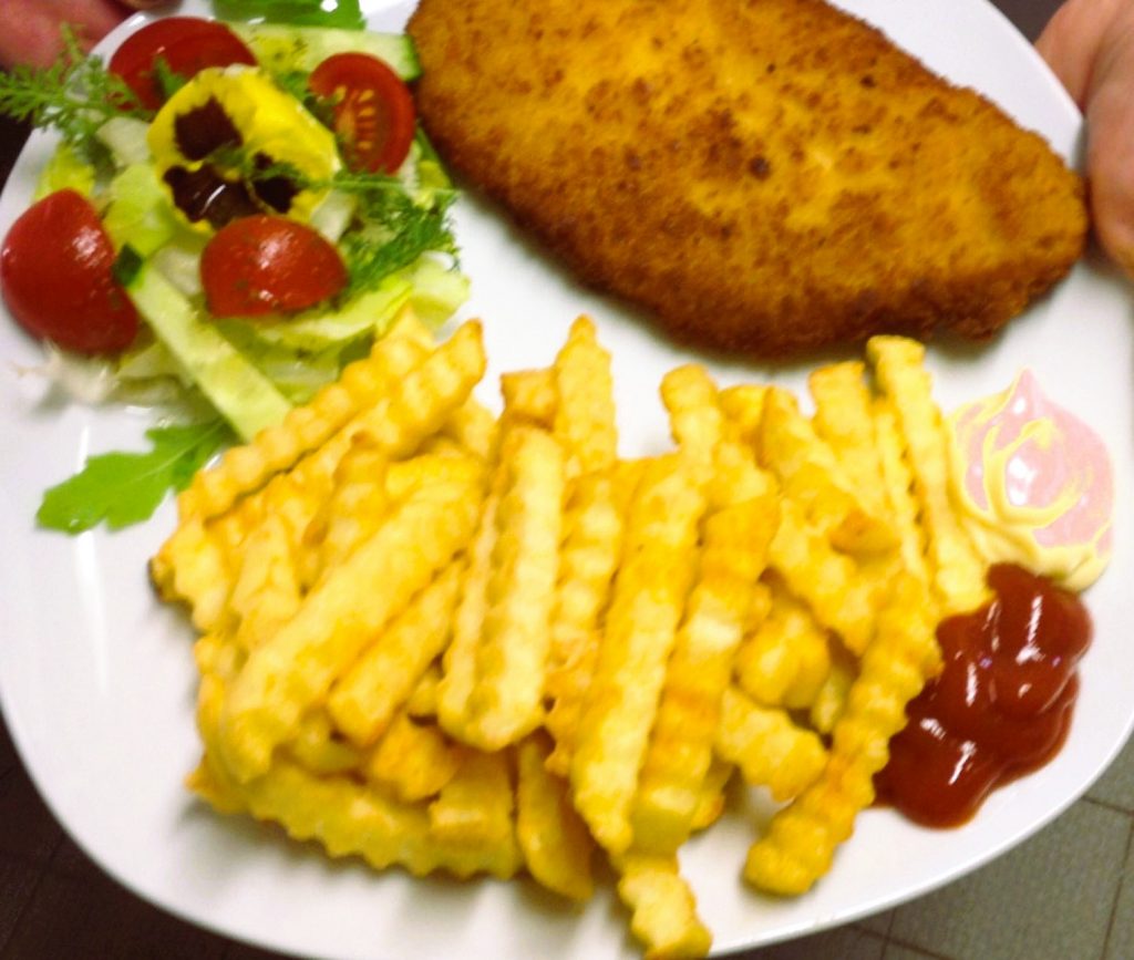 mit Ei, Pommes oder Kartoffelsalat und Salatbeilage